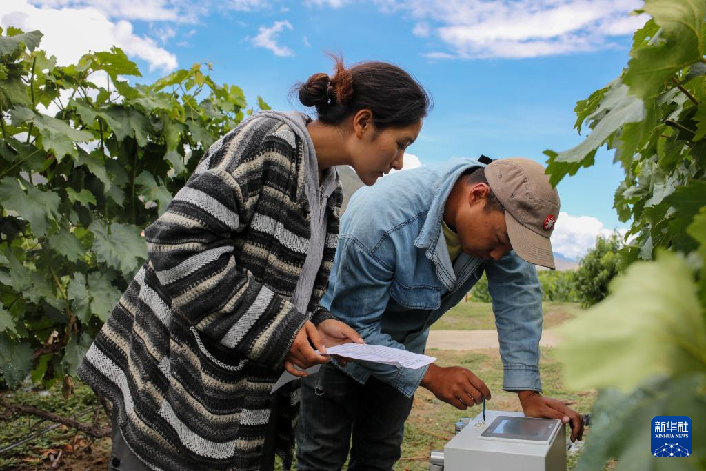 7月26日,桑日縣一家葡萄酒企業的員工曲珍(左)在葡萄園里向技術員何志榮學習操作光譜儀。新華社記者 姜帆 攝