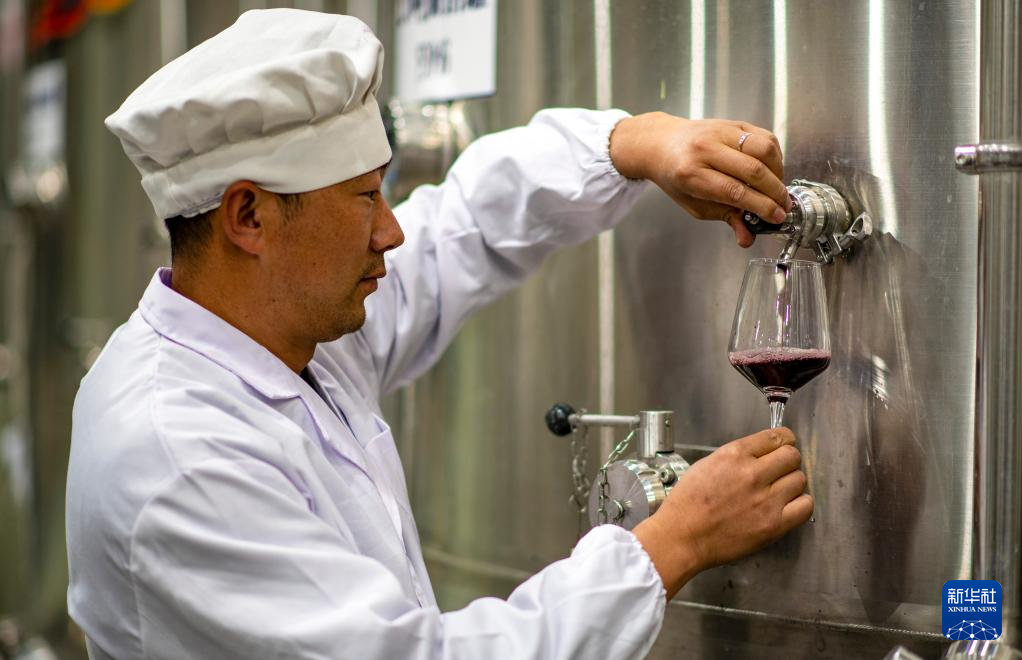 7月26日,桑日縣一家葡萄酒企業的釀酒師李曉平在發酵車間檢查酒樣。新華社記者 旦增尼瑪曲珠 攝