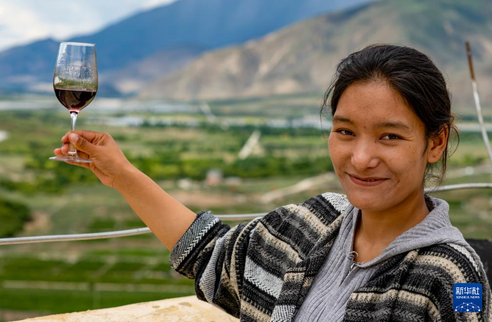 7月26日,桑日縣一家葡萄酒企業的員工曲珍在展示公司生產的葡萄酒。新華社記者 姜帆 攝