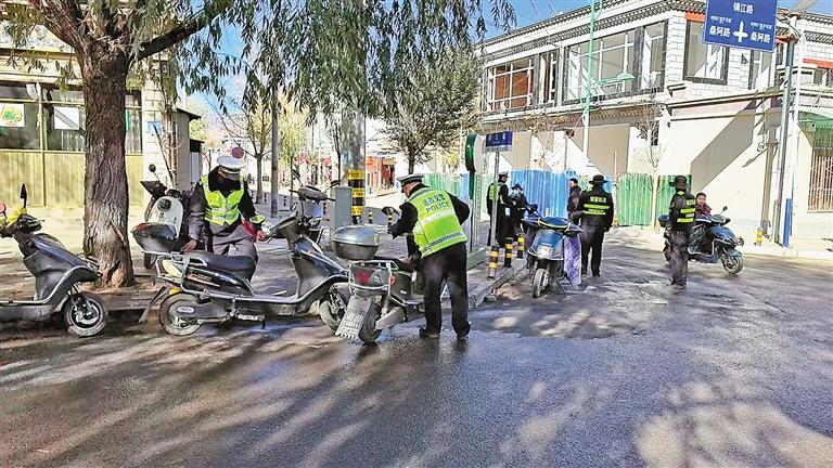 達孜區交警整頓非機動車亂停亂放等違法行為。拉薩記者站 攝