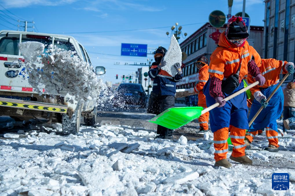 12月15日,環衛工人們在清掃積雪。新華社發(旦增努布攝)