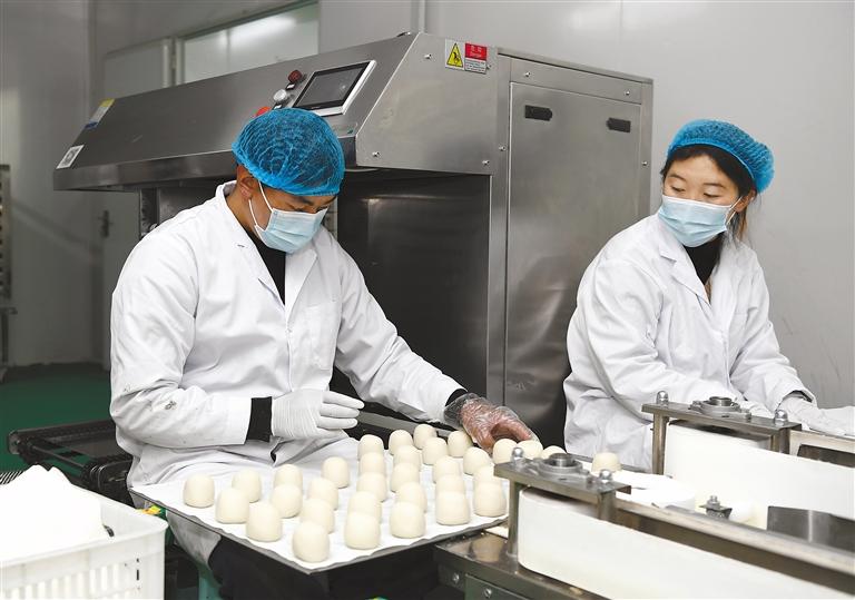 圖為昌都市邊壩縣藏紅麥加工廠的工人在生產線上制作食品。記者 王敏 攝