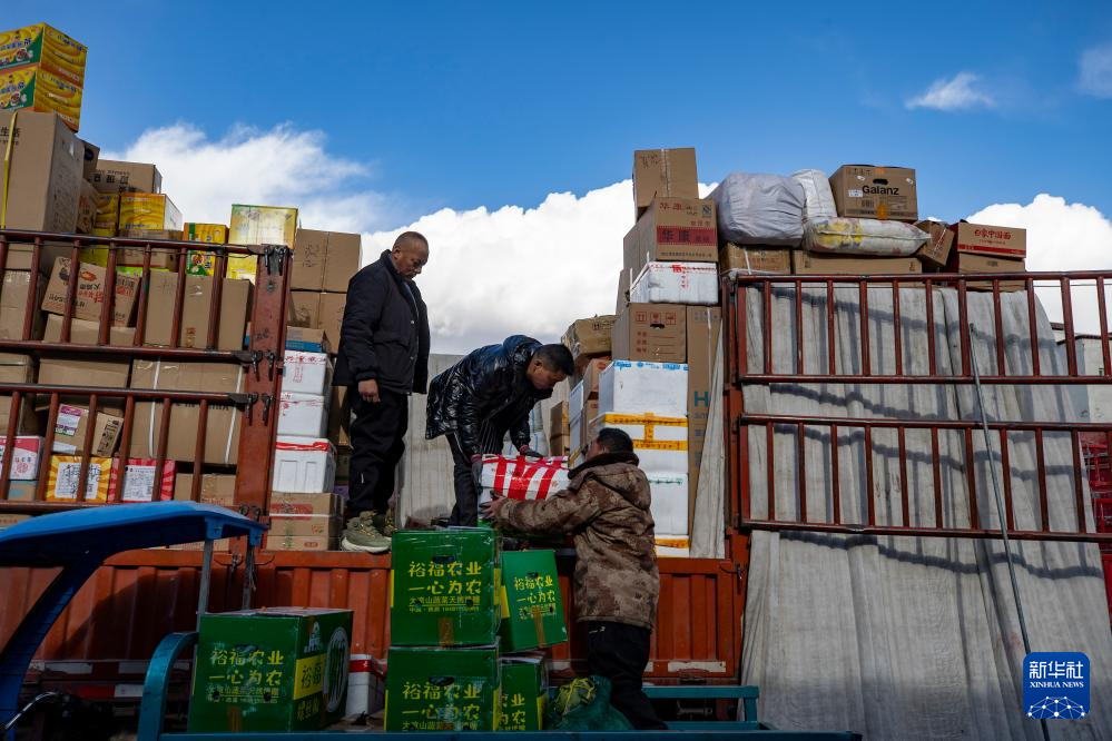 申扎縣供銷合作社員工在拉薩為偏遠鄉鎮果蔬配送試點項目的貨車上貨(1月2日攝)。新華社記者 姜帆 攝