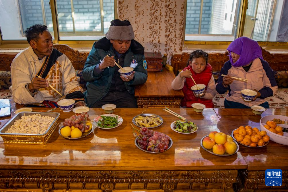 申扎縣馬躍鄉貝嘎四村村民次仁曲達(左一)家在吃飯,桌上的新鮮蔬菜和水果都是在村里的偏遠鄉鎮果蔬配送試點項目直銷點采購的,由供銷合作社當天配送而來(1月5日攝)。新華社記者 姜帆 攝
