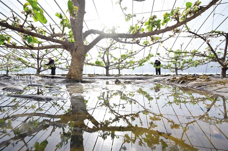 河北省灤州市茨榆坨鎮的果農在大棚內給櫻桃樹疏花。