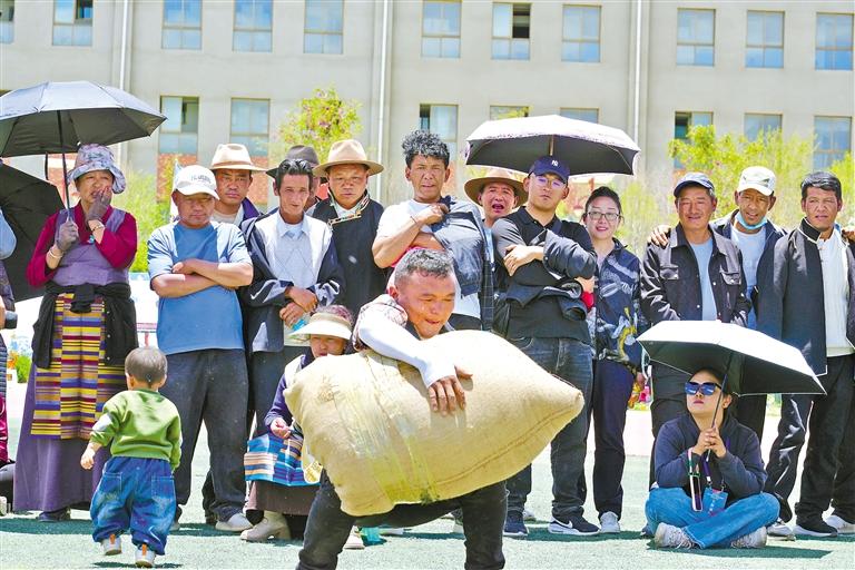 圖為桑珠孜區城北街道舉辦慶祝第八個“日喀則市民族團結進步日”暨“全民來健身 健康你我他”社區運動會。這是參賽選手在進行抱石頭比賽。