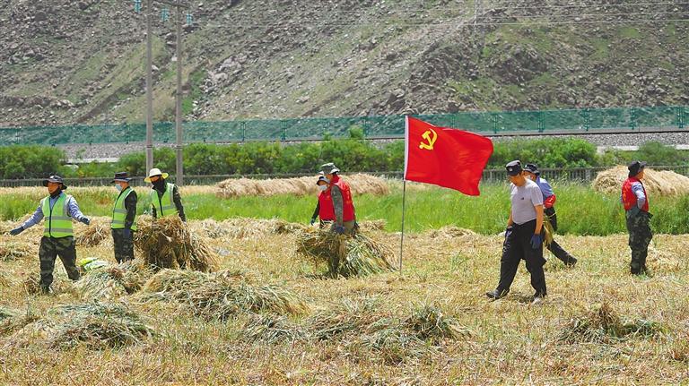 圖為拉薩市堆龍德慶區古榮護路大隊志愿服務分隊深入田間地頭,幫助農民收割青稞。