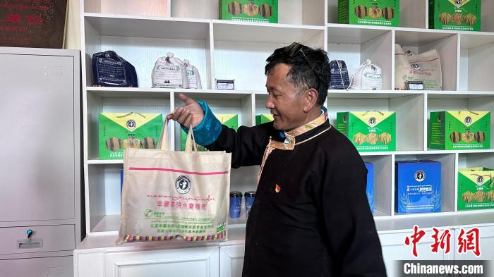 圖為申藏村黨支部書記旺扎正在向記者展示糌粑產品。澤塔雍措 攝