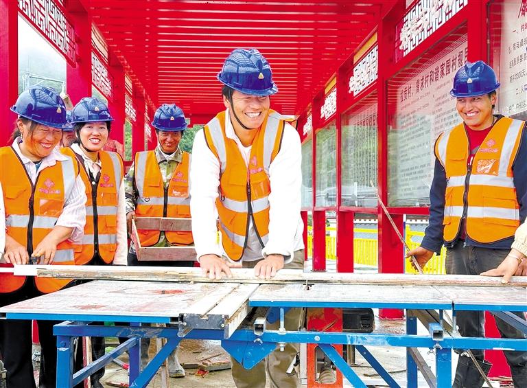 圖為村莊基礎設施提升項目現場,曾求村村民在加工木材。記者 旦增蘭澤 通訊員 朗玲 攝