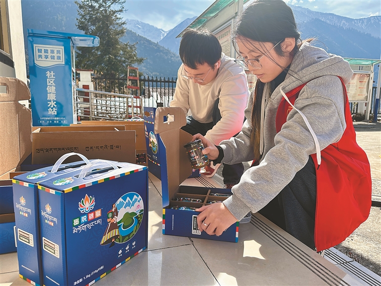 圖為墨脫縣格當鄉黨員干部將辣椒醬裝箱。記者 王敏 通訊員 郎玲 攝
