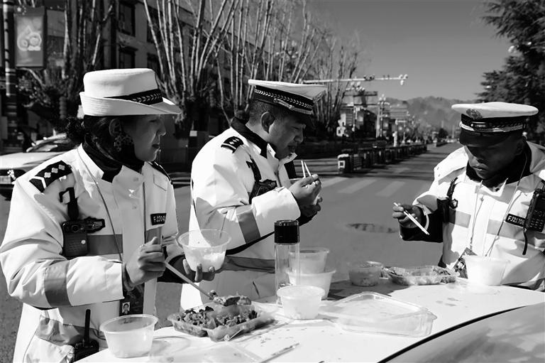 圖為交警在執(zhí)勤路口簡易用餐。圖由日喀則交警提供