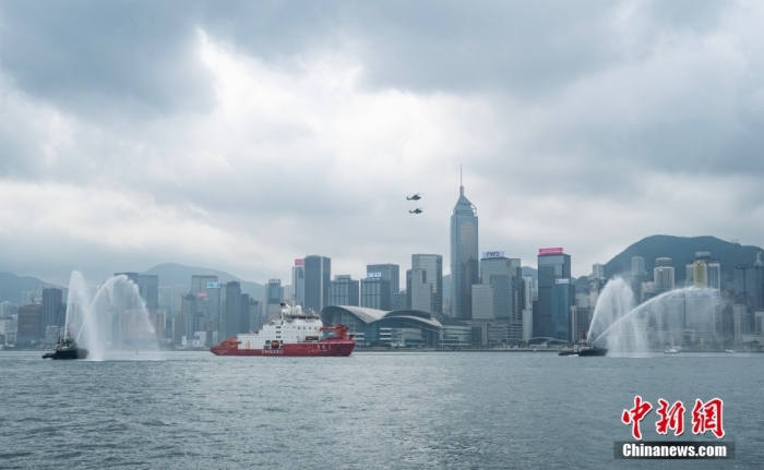4月8日上午,中國首艘自主建造的極地科學考察破冰船“雪龍2”號抵達香港。圖為“雪龍2”號通過維多利亞港時收到海事傳統噴水歡迎。中新社記者 侯宇 攝