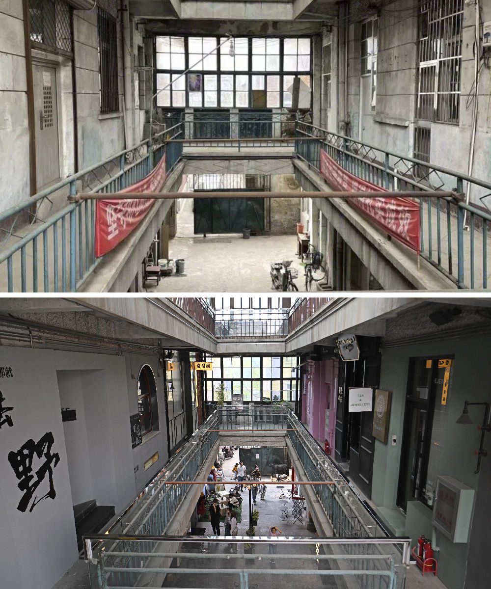 拼版照片:上圖是五大道重慶道225號廢棄廠房內景(資料照片);下圖是修繕后的五大道重慶道225號創(chuàng)意街區(qū)(4月13日攝)。