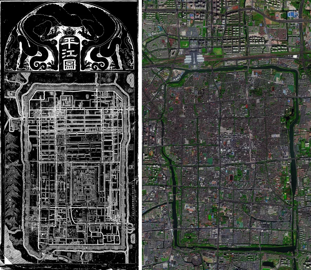 拼版照片:左圖為宋代碑刻《平江圖》(資料照片);右圖為2023年3月拍攝的蘇州古城的衛星圖像。新華社發
