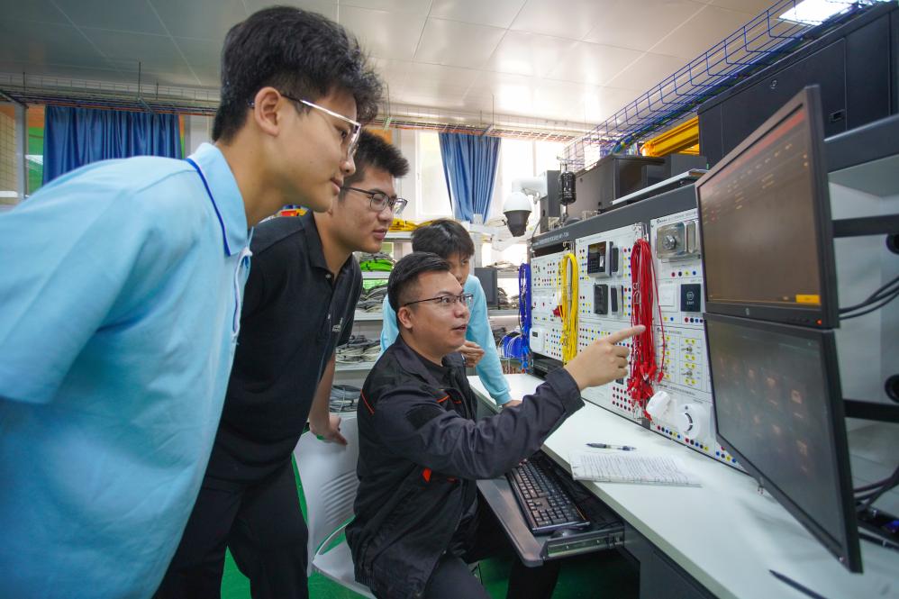 梁嘉偉(前排右一坐者)正在向學生傳授技術課程。新華社記者胡拿云 攝