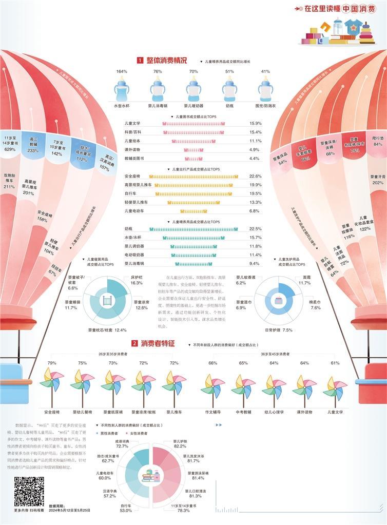 消費者精致育兒需求不斷升級,圍繞功能需求細分、場景消費精細化等維度的兒童用品受到越來越多關注。在兒童喂養用品消費中,水壺水杯、嬰兒消毒鍋、嬰兒暖奶器、奶瓶等成交額同比增長超五成;在兒童洗護用品消費中,嬰童牙膏、嬰童按摩油等產品成交額同比增長超100%。