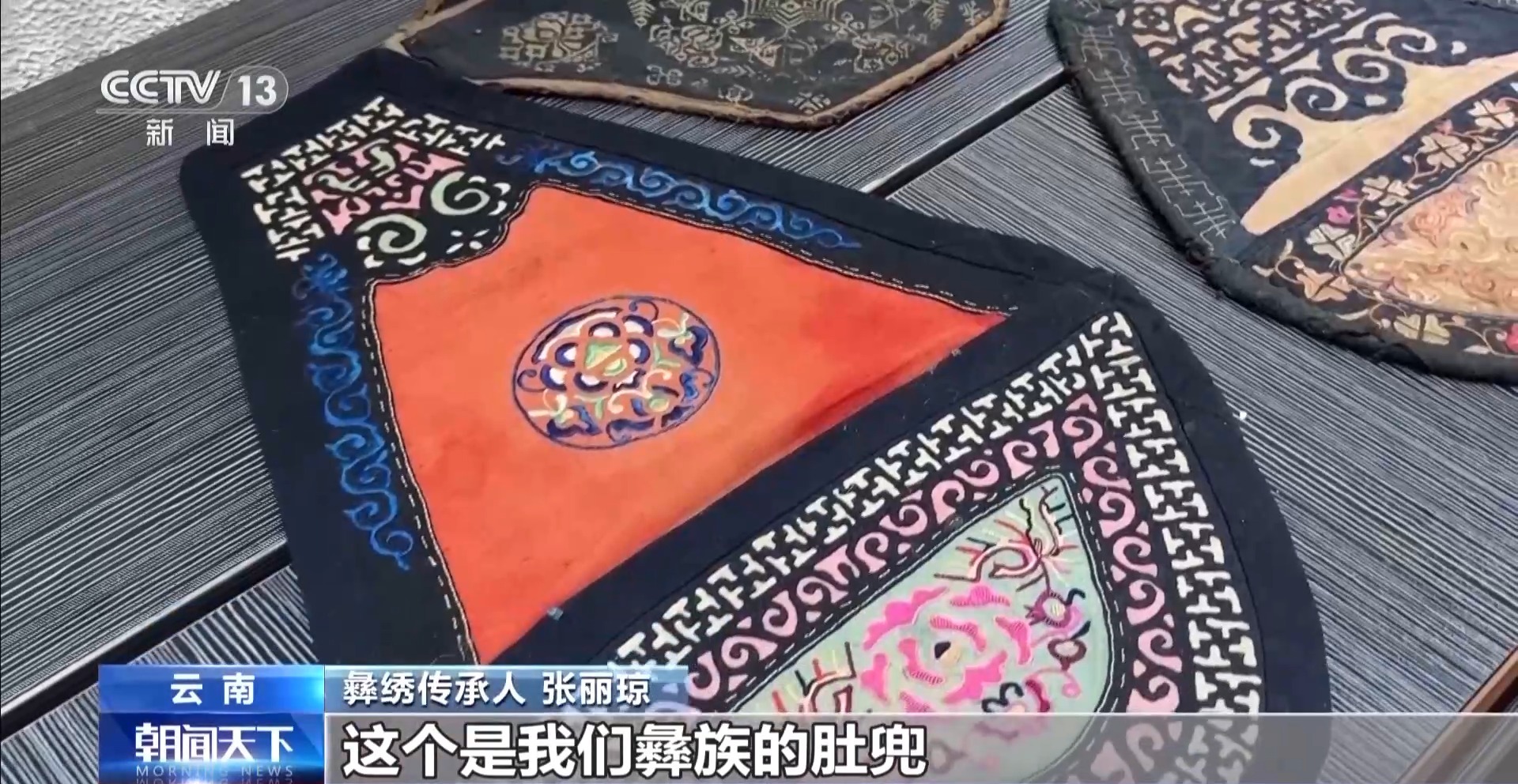 彝繡傳承人 張麗瓊:這個(gè)是我們彝族的肚兜,是彝族小姑娘送給彝族小伙子的定情物。它上面有很多現(xiàn)在已經(jīng)失傳的刺繡針?lè)?,像貼布繡、長(zhǎng)針繡、平針繡。