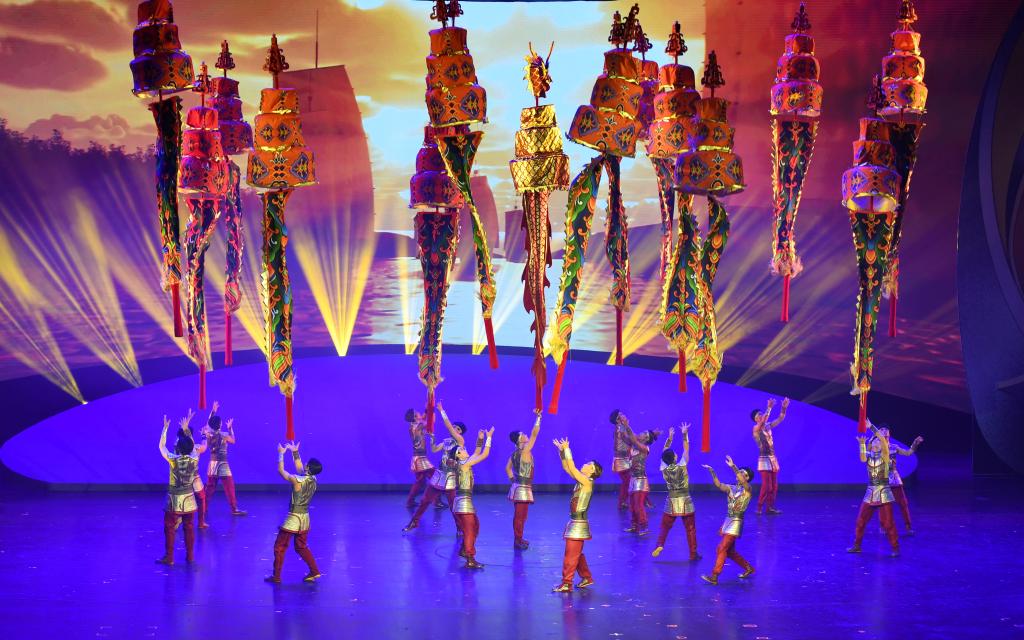 2023年10月25日,在第十九屆中國吳橋國際雜技藝術節(jié)上,中國雜技演員在表演《龍躍神州——中幡》。