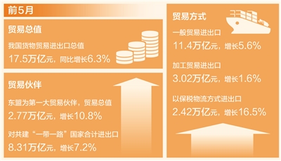 我國外貿(mào)前5月成績單近日出爐,貨物貿(mào)易進(jìn)出口總值同比增長6.3%。其中,出口增長6.1%,進(jìn)口增長6.4%。5月當(dāng)月,進(jìn)出口同比增長8.6%,出口增長11.2%,進(jìn)口增長5.2%。