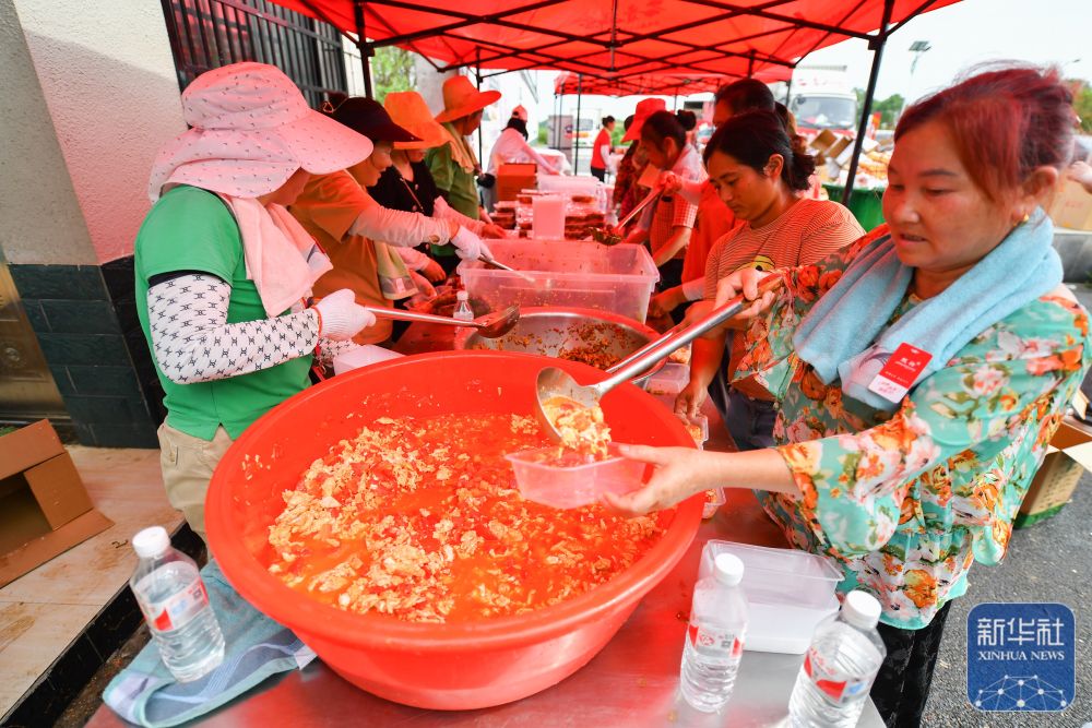 7月10日,在岳陽市良心堡鎮望君洲村,志愿者倒出炒好的菜肴準備打包。新華社記者 陳振海 攝