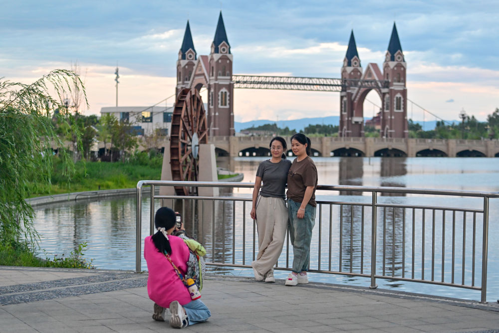 在伊犁哈薩克自治州伊寧市喀贊其民俗旅游區,游客在特色民宿拍照打卡(7月27日攝)。