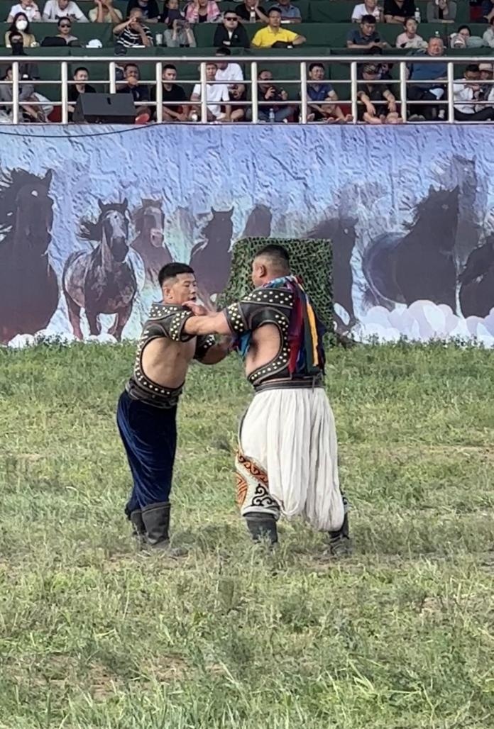 阿斯琴:包括腰力、轉動能力和手臂的力量。(牧民的傳統)馴馬、馴牛、馴駱駝,不能用蠻力,要有巧勁,要有這方面的天賦才行。比賽規則就是單排淘汰,倒了就不能再上了。一跤定勝負,這是它摔跤的特點。