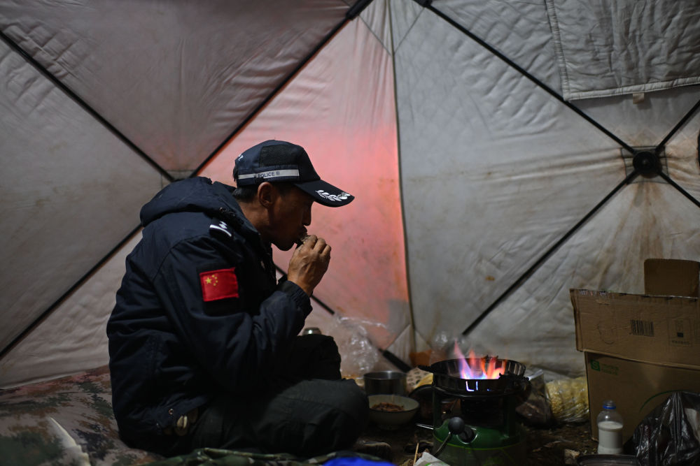 7月8日,在可可西里卓乃湖區域,巡山隊員尼瑪扎西在帳篷里吃晚飯。新華社記者 張龍 攝