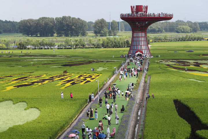 時值暑假,盤錦紅海灘國家風景廊道游客如織。登上觀景臺,向南望去是成片的紅海灘,轉身再看,一幅巨大的稻田畫在風中搖曳,令人心曠神怡。