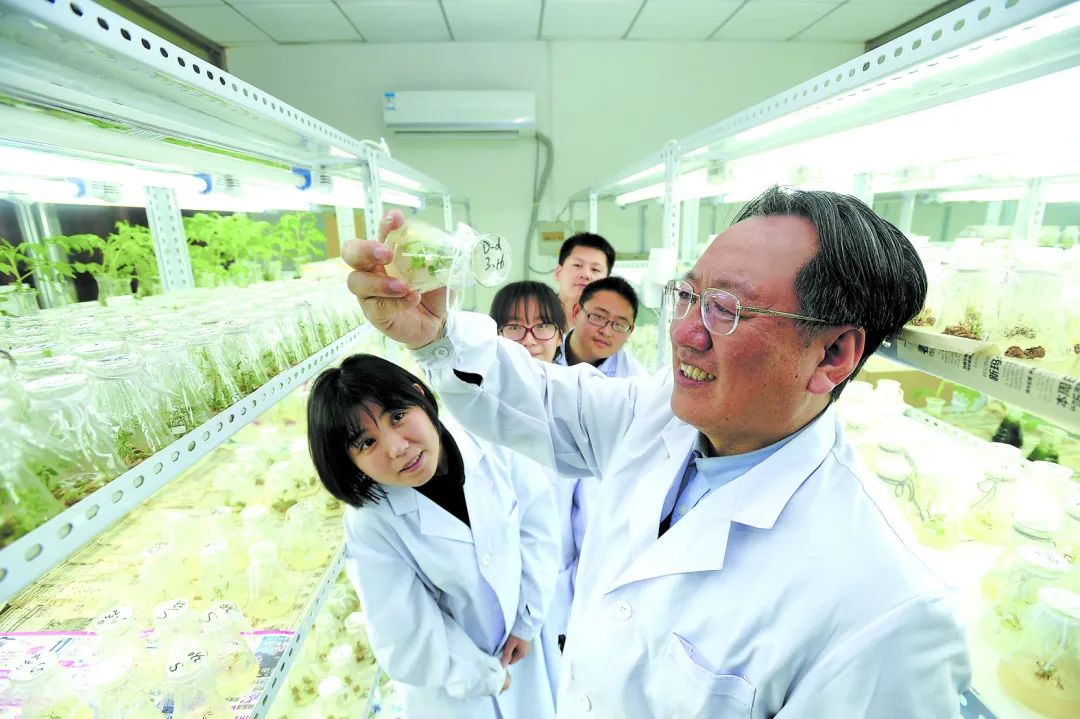 沈陽農業大學教授李天來院士在實驗室指導研究生開展科研,觀察番茄遺傳轉化過程等情況。