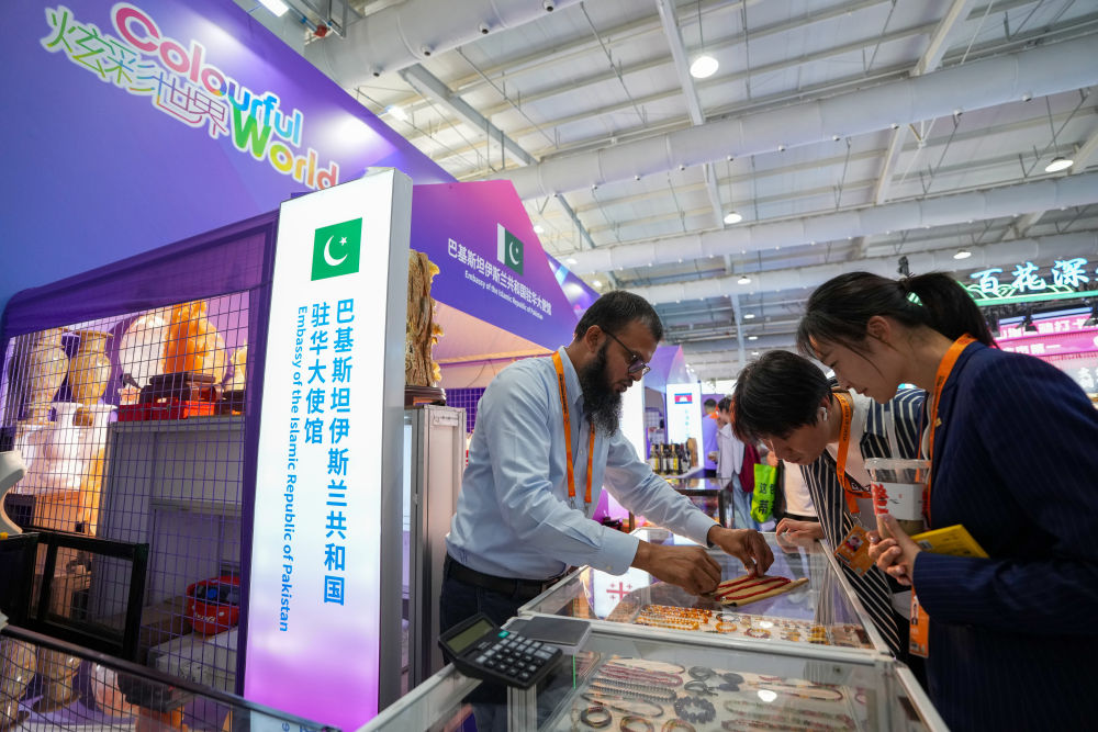 9月12日,在服貿會首鋼園區的炫彩世界——‘一帶一路’沿線國家特色文化展示活動上,參觀者在巴基斯坦伊斯蘭共和國駐華大使館展區選購商品。新華社記者 鞠煥宗 攝