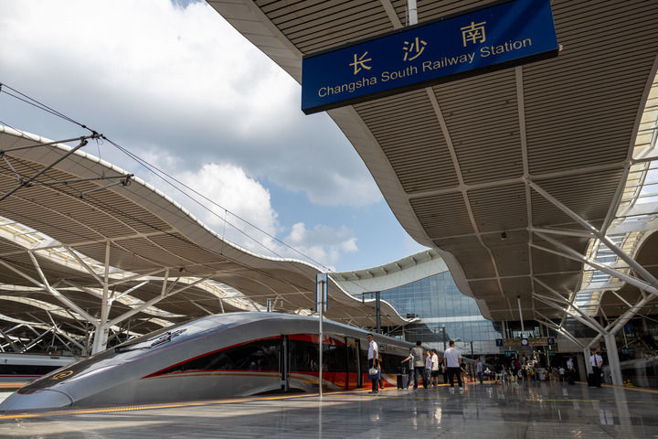 2024年6月15日,武漢至深圳北的G875次列車經停長沙南站。當日,京廣高鐵武廣段復興號動車組列車按時速350公里高標運營,標志著京廣高鐵武漢至廣州段安全標準示范線全面建成,京廣高鐵全線實現復興號動車組列車按時速350公里高標運營。新華社記者 伍志尊 攝