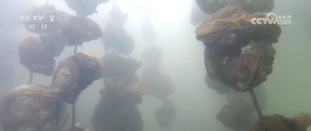 通過水下鏡頭可以看到,蠔苗被放下去的時候就固定在了水泥石餅上,每串石餅大約固著有40個。養殖戶們說,這種吊樣的方式不僅讓生蠔長得好,還能方便捕撈。像1.6畝大小的蠔排可以吊養蠔苗大概1.2萬串,整個基地蠔苗的年產量達13.45萬噸。