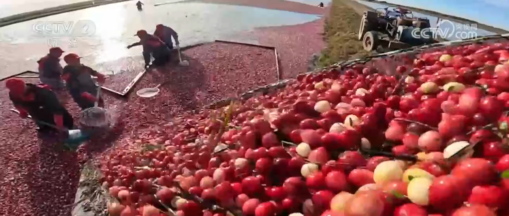 成熟的蔓越莓怎么收獲呢?轉(zhuǎn)過來看這里,這就是記者所說蔓越莓的地塊為什么像池塘,因為這里灌進水,工作人員就駕駛著采收機就可以收獲了,采收機上有兩排鋼條,它能將水里的蔓越莓從植株上脫落下來。因為蔓越莓里面是空心的,所以能夠浮在水面上。我們看,采收機走過之后,后面的蔓越莓就漂上來了。工作人員只需要來回多次的行駛,就可以把成熟的果子都收獲下來,這種方式收獲率可以達到97%以上。每個地塊都這么大,飄在水上的蔓越莓怎么才能收回來呢?工作人員在水里用木板把這些蔓越莓聚攏到一起,再通過提升機就可以裝到車廂里了。每到蔓越莓收獲的季節(jié),田里就變成了紅色的海洋,非常漂亮。