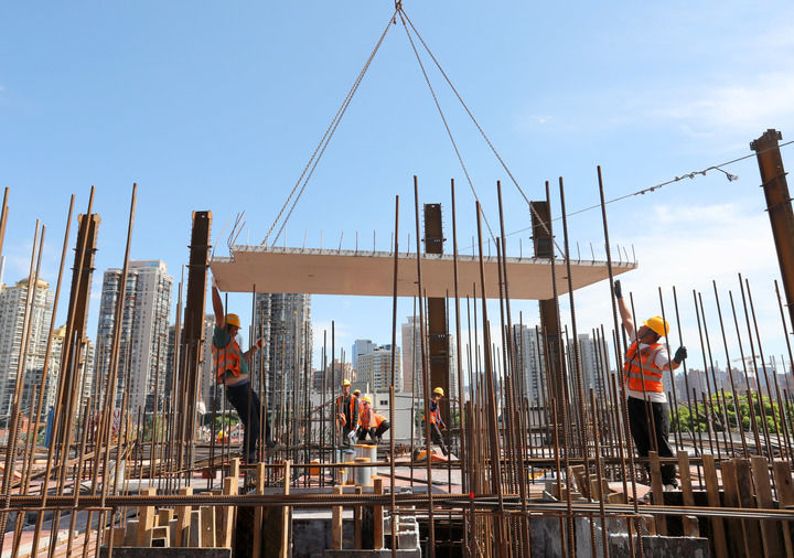 10月3日,中建二局的建設者在位于上海市中心的一處建筑工地施工。新華社記者 方喆 攝