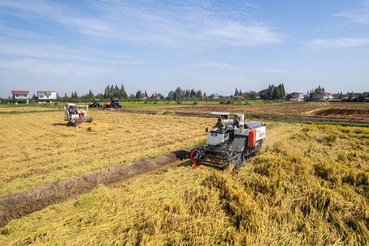 10月2日,湖南省益陽市南縣麻河口鎮蔡家鋪村村民開展水稻機械收割作業(無人機照片)。新華社記者 陳思汗 攝