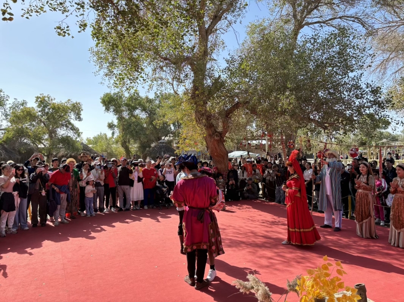 國慶期間,游客在觀看尉犁縣羅布人村寨景區民俗表演。 羅布人村寨景區供圖