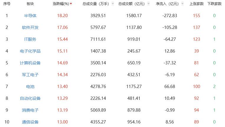 板塊方面,半導體、軟件開發、IT服務、電子化學品、計算機設備等漲幅居前。