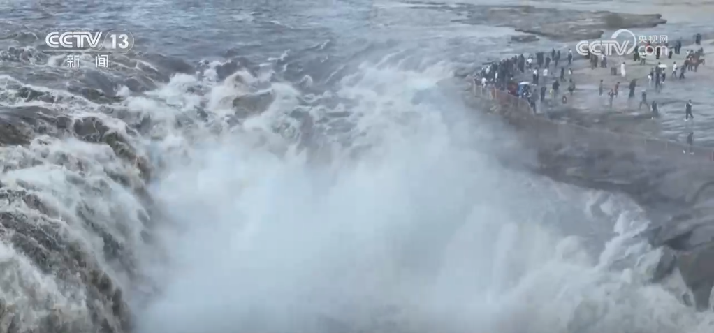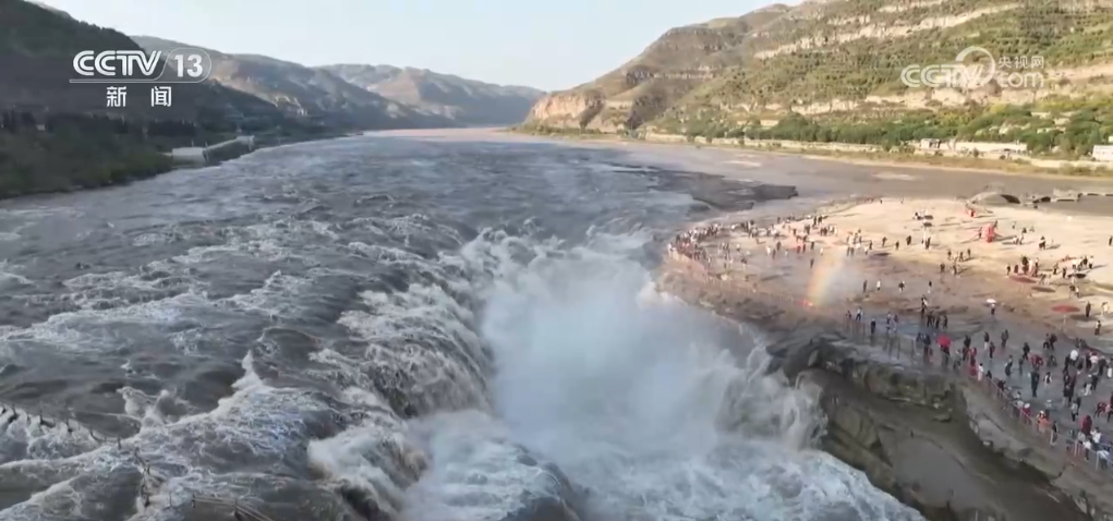 連日來,受上游水庫調節放水影響,位于山西吉縣和陜西宜川縣交界的黃河壺口瀑布水量豐沛。從空中俯瞰,黃河流經晉陜峽谷到達壺口,水面由三四百米寬驟然收縮為50多米,再墜入“十里龍槽”,濺起數十米高的水霧,氣勢磅礴。據了解,黃河壺口段目前正處于秋汛期,最大水流量約為1300立方米/秒,是日常水流量的3倍,主瀑與副瀑連成一片,呈現出一條線狀,場面壯觀。進入10月份以來,黃河壺口瀑布景區日均接待游客超過2萬人次。
