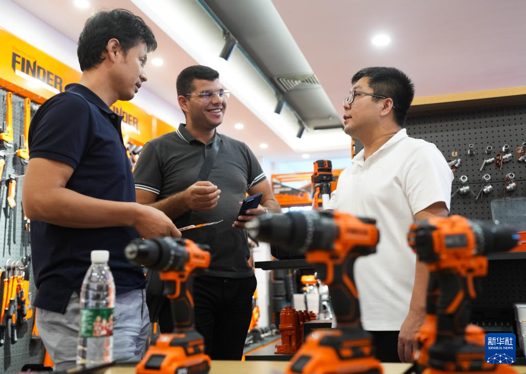 義烏發現者進出口有限公司銷售部經理艾彬(右)向來自突尼斯的客戶介紹鉆頭(10月9日攝)。新華社記者 翁忻旸 攝