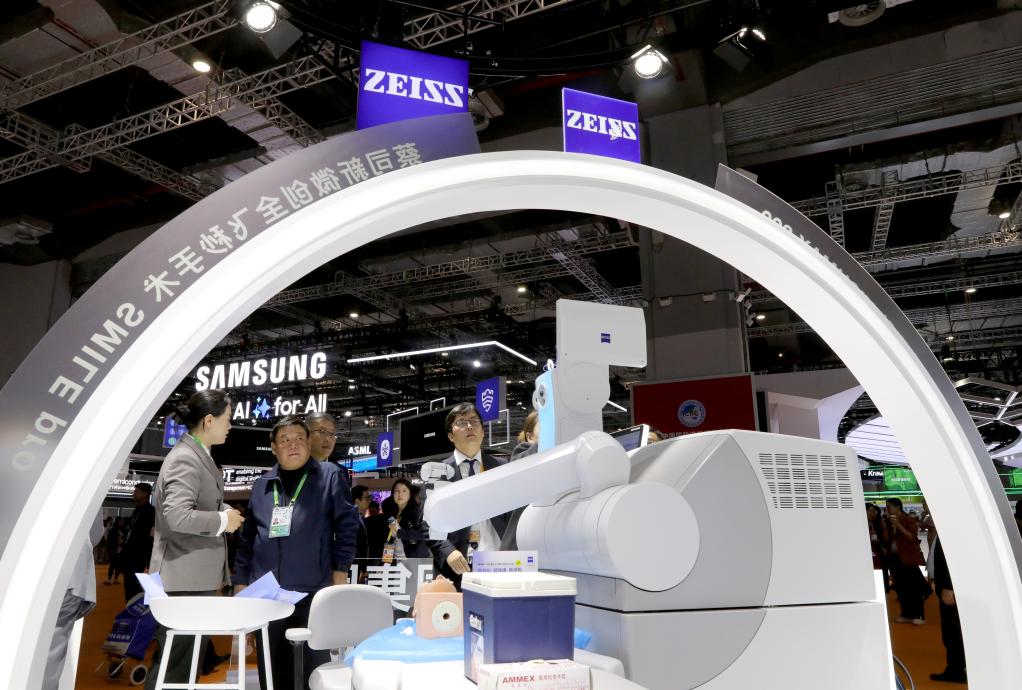 11月6日,參觀者在蔡司公司展臺展出的新一代機器人全飛秒前交流討論。這是該產品在進博會上的首展。新華社記者 方喆 攝