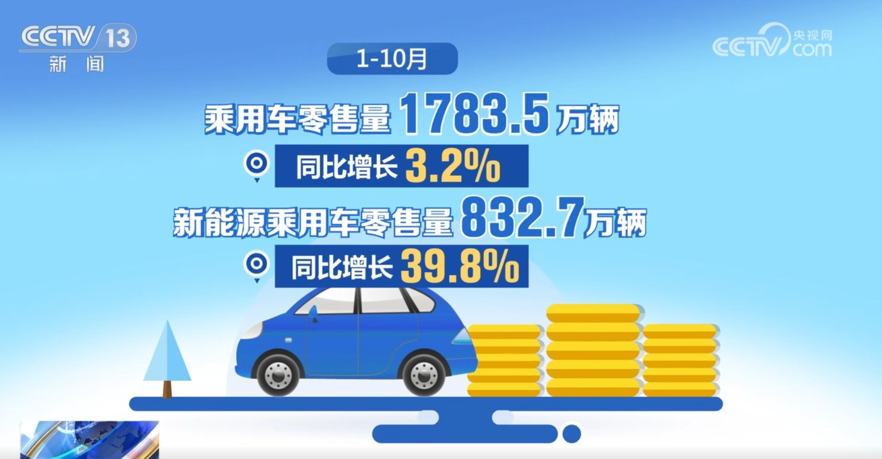 在以舊換新政策的帶動下,汽車銷量也有了明顯增長。10月份,乘用車零售量226.1萬輛,同比增長11.3%,增速較9月加快6.8個百分點。其中,新能源乘用車零售量119.6萬輛,同比增長56.7%,增速較9月加快5.8個百分點,占乘用車零售量的比重達52.9%。1—10月,乘用車零售量1783.5萬輛,同比增長3.2%。其中,新能源乘用車零售量832.7萬輛,同比增長39.8%。