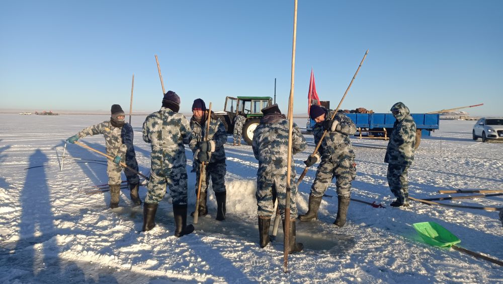 遼闊的達里湖銀裝素裹,在零下二十攝氏度左右的嚴寒中,漁業工人們開始了一系列精細而有序的冬捕作業準備工作。