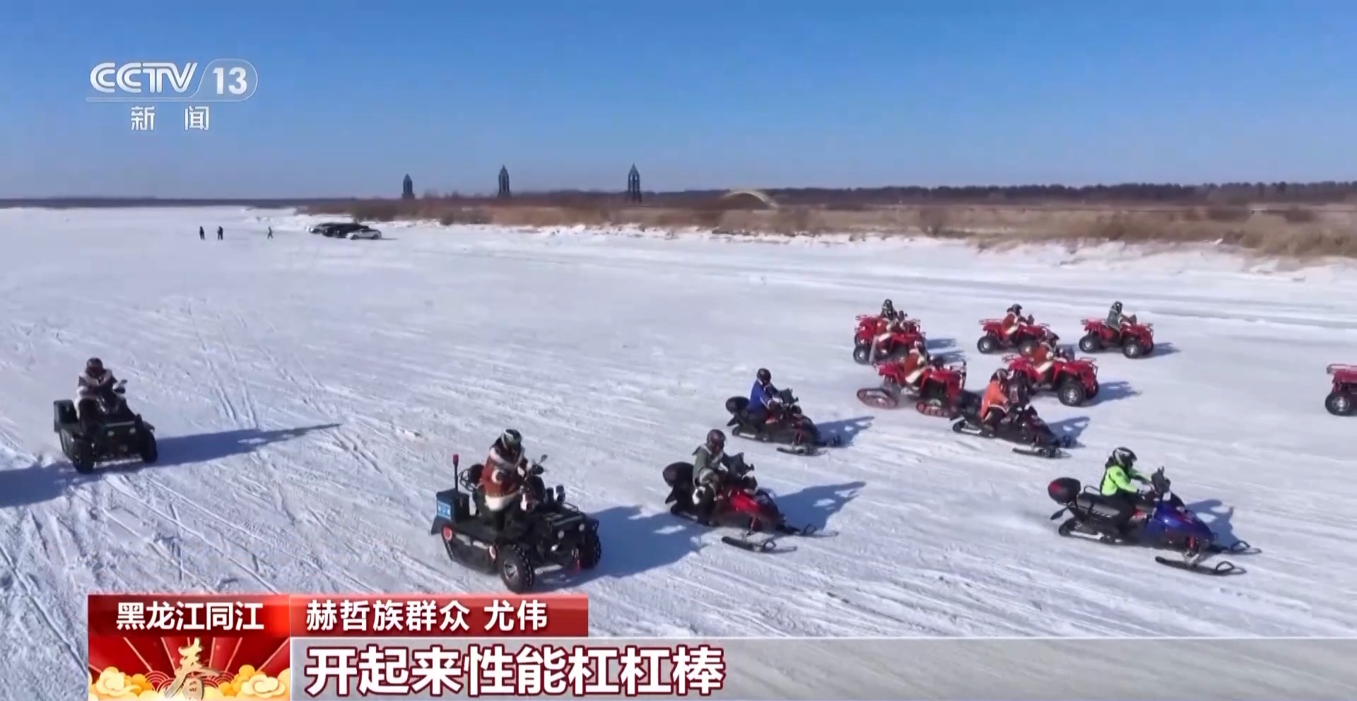 赫哲族群眾 尤偉:都以為赫哲族不以漁獵為主嘛,后期生活水平提高了,這款雪地摩托車是我們廠自己研發的,開起來性能杠杠棒。作為我們騎手來說,心情可好可棒了。