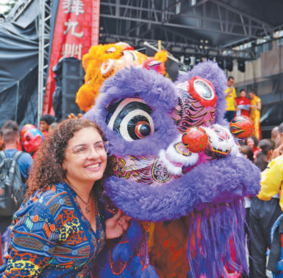 當(dāng)?shù)貢r(shí)間2月1日,在巴西圣保羅市中心自由廣場舉辦的歡樂春節(jié)園游會開幕式上,當(dāng)?shù)孛癖娕c舞獅表演者合影。記者 時(shí)元皓攝
