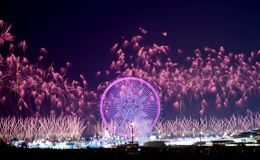 2025年2月7日,焰火在開幕式分會場上空綻放。