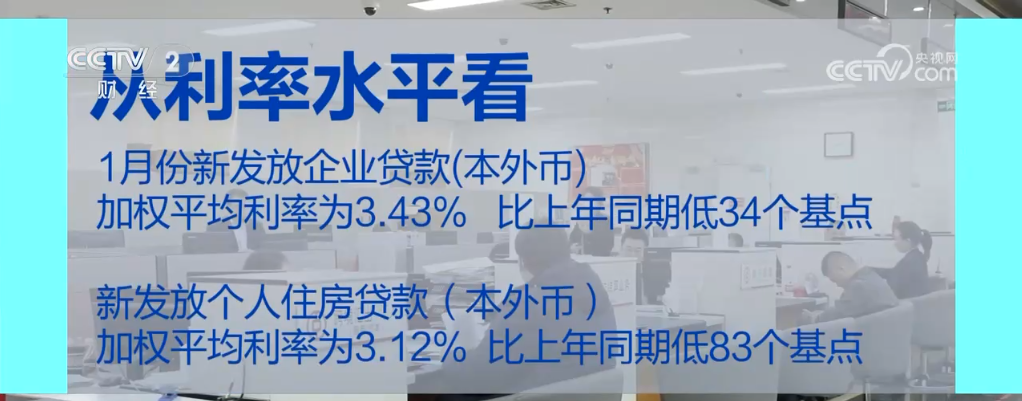 從利率水平看,貸款利率繼續保持在歷史低位。1月份,新發放企業貸款(本外幣)加權平均利率為3.43%,比上年同期低34個基點;新發放個人住房貸款(本外幣)加權平均利率為3.12%,比上年同期低83個基點。