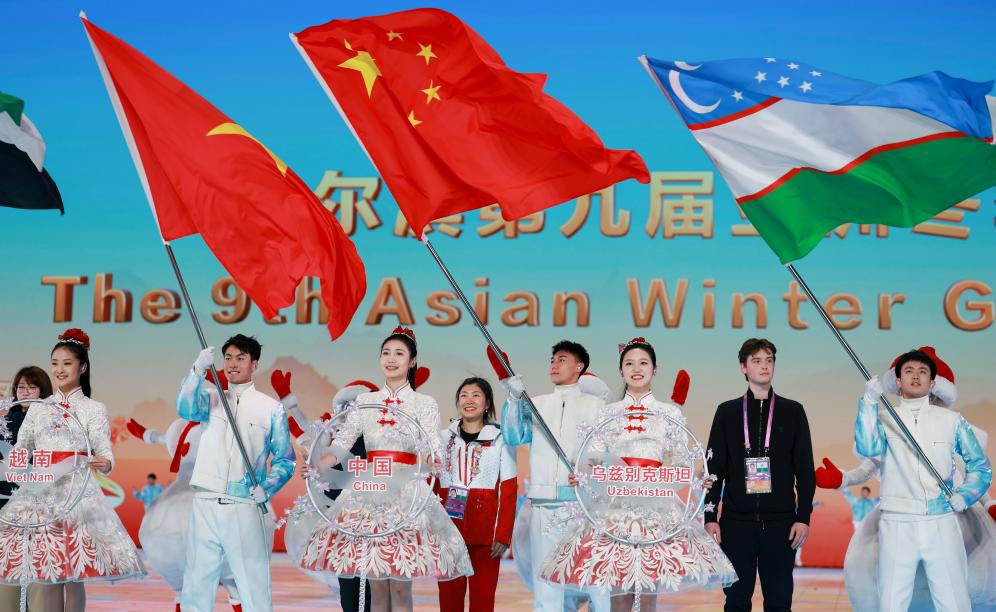 2月14日,第九屆亞洲冬季運動會閉幕式在哈爾濱舉行,這是各體育代表團入場環節。新華社記者 許雅楠 攝