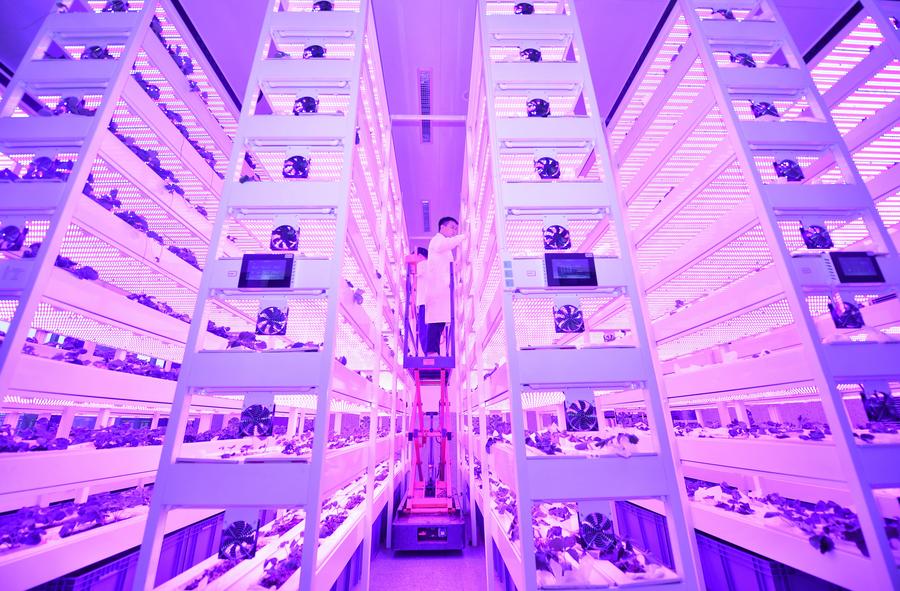 科技人員在中國農(nóng)業(yè)科學院都市農(nóng)業(yè)研究所智能植物工廠觀察農(nóng)作物生長情況(2024年10月16日攝)。新華社記者 劉坤 攝