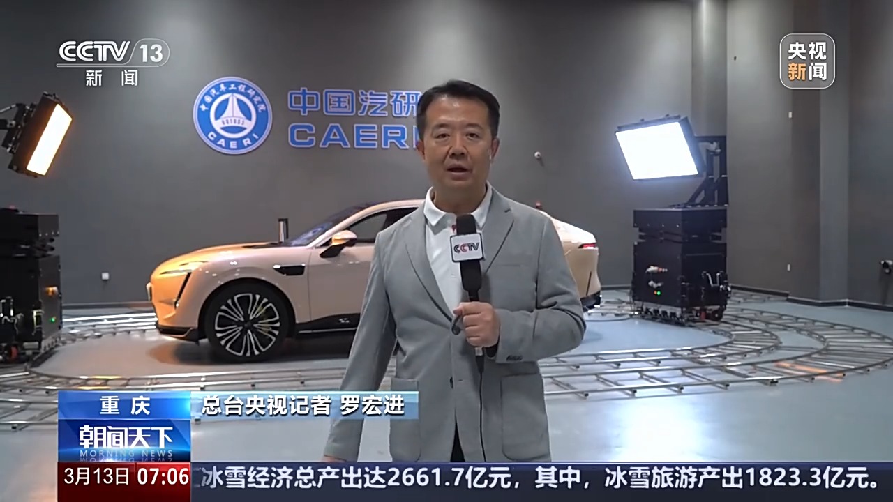 總臺央視記者 羅宏進:來到中國汽車工程研究院的整車光環境實驗室,我們可以看到,我身后有兩臺能夠360°移動的光源,它可以模擬一年四季一天24小時不同時刻的光線。智能網聯新能源汽車的快速發展,車上攝像頭的數量明顯增加,就好比人的眼睛一樣,要給它們進行精準的檢測。