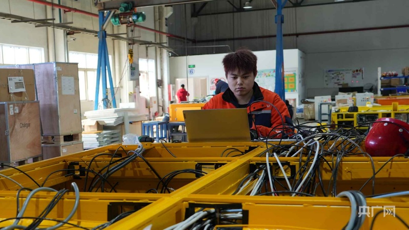 工作人員正在進行重載AGV安裝調(diào)試(央廣網(wǎng)記者 周思楊 攝)